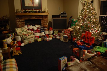 Here is the living room after Santa came. There is not much room left, not sure there is any room for more grandkids!