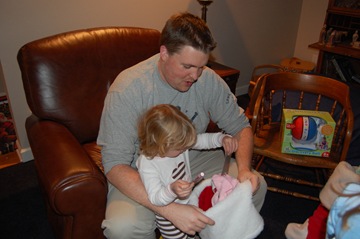 Ellie going through her stocking with Daddy.