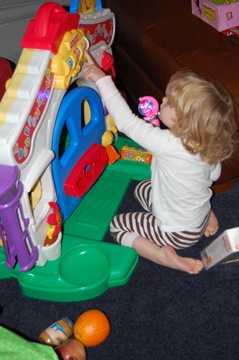 Ellie made the rounds playing with the toys Santa brought everyone. Here she is playing with Cousin Will's toy!