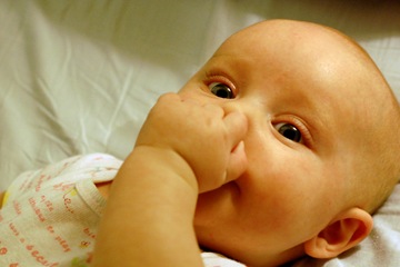 Baby Megs tries very hard to suck her thumb. She can get it in her mouth pretty quick now. She will even take the pacifier out and put her thumb in. Here she is trying to get her fist in her mouth.