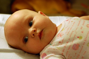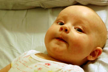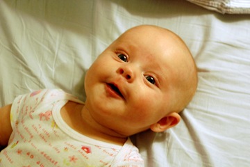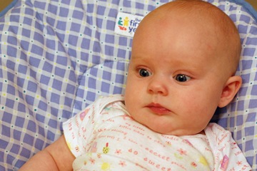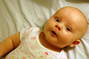 Baby Megs tries very hard to suck her thumb. She can get it in her mouth pretty quick now. She will even take the pacifier out and put her thumb in. Here she is trying to get her fist in her mouth.